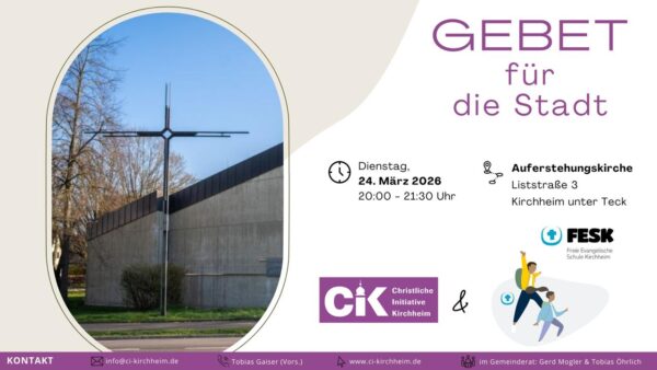 Wir treffen uns am 24.03.2026 um 20:00 Uhr in der Auferstehungskirche im Clubraum. Dabei sind die FESK (Freie Evangelische Schule Kirchheim) und Axel Rickelt (Pfarrer